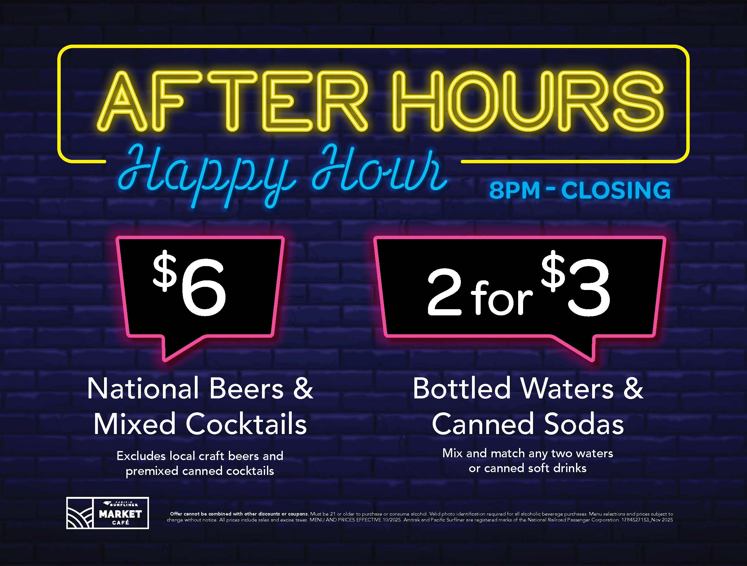 The Pacific Surfliner offers an onboard café with a variety of snacks, light meals, and beverages. Located in the lower level of Car 3, the Market Café features a rotating selection of local products, including selections from California’s top breweries and wineries.